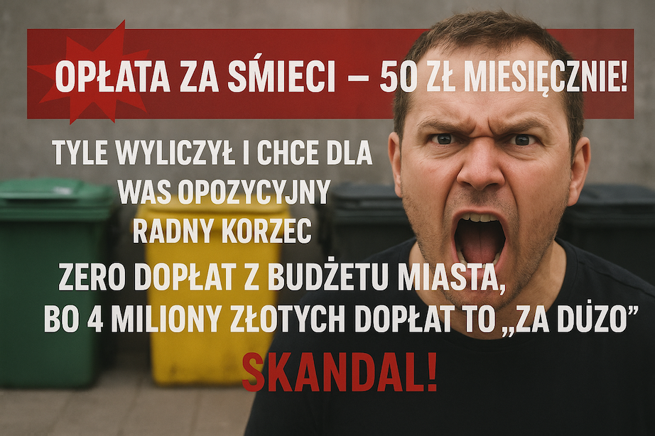 Opozycja mówi: SKANDAL! „Apelowaliśmy, że pieniądze z opłaty śmieciowej się skończą”. „Wyciągnięte 4 miliony z budżetu to dużo”. Czyli w skrócie: nie dopłacać z budżetu miasta do odbioru śmieci. Mówiąc wprost — opozycja namawia, żeby podnieść Państwu opłaty za śmieci. Nawet do 50 złotych miesięcznie – jak wylicza radny Korzec.