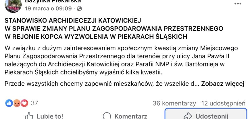 Zmiana planu nie wpłynie negatywnie na wygląd ani charakter otoczenia Kopca Wyzwolenia. Miejsce to posiada szczególne znaczenie historyczne i duchowe – zarówno dla Archidiecezji, jak i Parafii oraz całej społeczności miasta, a także regionu. Zachowanie jego wyjątkowego charakteru pozostaje dla nas priorytetem.