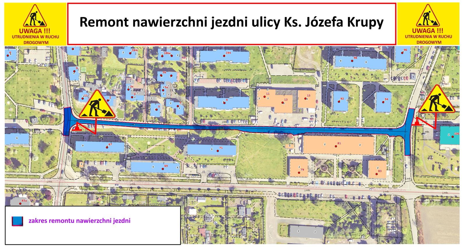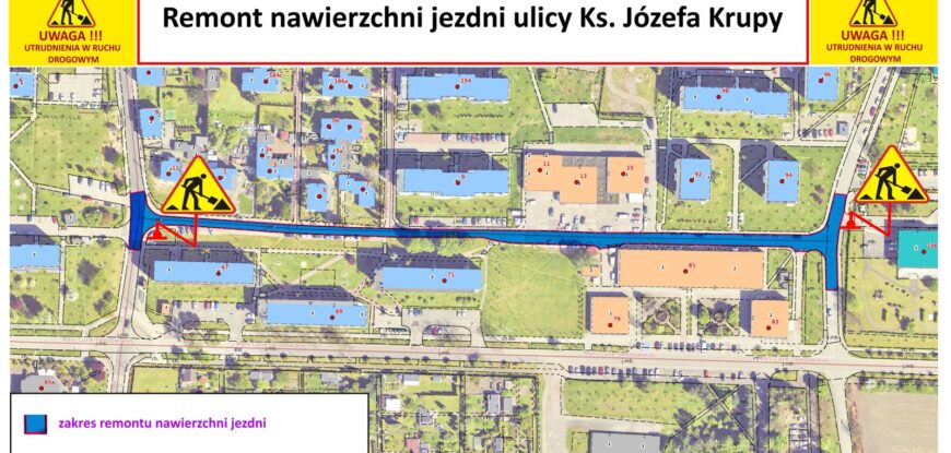 Jeśli chodzi o ulicę Krupy – zaczynamy remont nawierzchni od ulicy Brzechwy do Marii Curie-Skłodowskiej – w planach nowa nakładka asfaltobetonowa, remont skrzyżowań i utwardzenie poboczy.