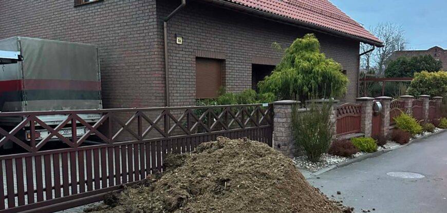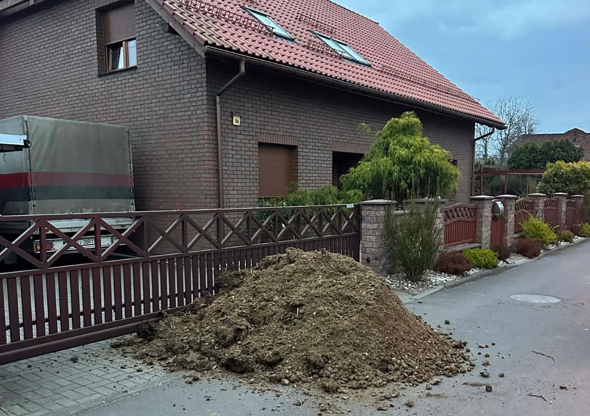 Wielka kupa nawozu została wyrzucona przed domem radnego Dariusza Painty. Dlaczego? Na sesji Rady Miasta odrzucony został Miejscowy Plan Zagospodarowania Przestrzennego dla Dąbrówki Wielkiej w rejonie ulicy Szybowej. Za przyjęciem planu głosowało 10 radnych, przeciwko było 11. Dokument został odrzucony i nie wszystkim się to podoba.
