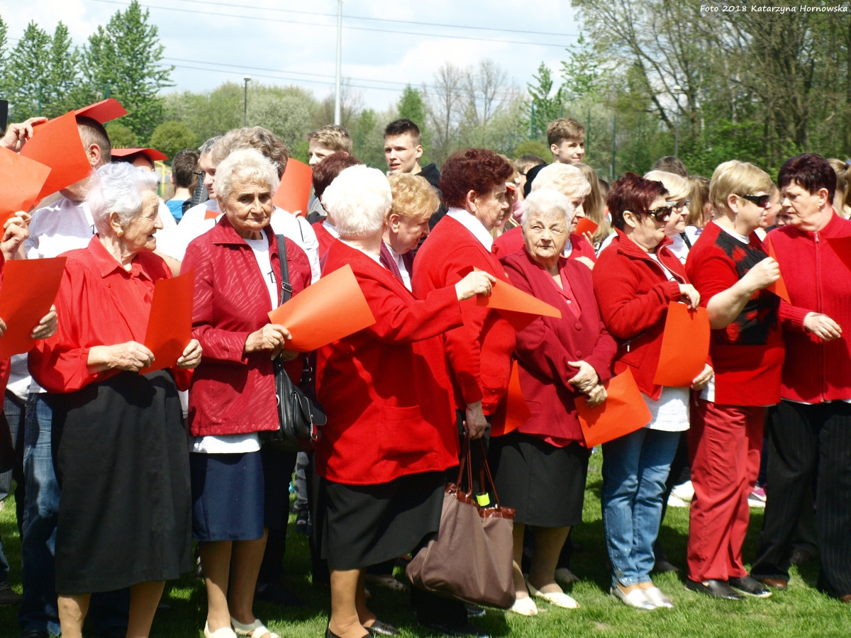 W południe przyszedł czas na kolejną, tym razem wielką “żywą” flagę którą na boisku MOSiR ułożyli uczniowie i nauczyciele (m.in. MSP 1, 9, 11, MG 1,2,3,4 i ZS 1, I LO – AZS, ZSS im. Marii Grzegorzewskiej), przedstawiciele piekarskich Klubów Seniora Radość, Sielanka oraz Dziennego Domu Pomocy Społecznej, mieszkańcy miasta. Wśród osób, które stały się częścią biało-czerwonej flagi nie zabrakło Prezydent Miasta Sławy Umińskiej-Duraj, radnych: Natalii Ciupińskiej-Szoska, Stanisława Plajznera, Adriana Szastoka, Czesława Wymysło, i pomysłodawcy akcji “Wywieś flagę w oknie” Łukasza Ściebiowskiego i pracowników MOSiR.