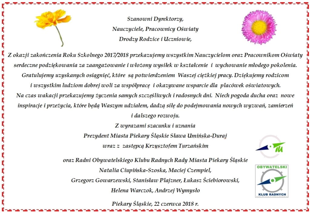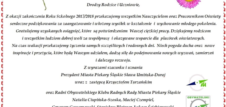 Wszystkim Pracownikom Oświaty, Uczniom i ich Rodzicom dziękujemy za zaangażowanie w kończącym się roku szkolnym 2017/2018. Gratulujemy osiągnięć i uzyskanych wyników. Życzymy Wszystkim udanych, radosnych i bezpiecznych wakacji!