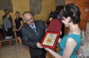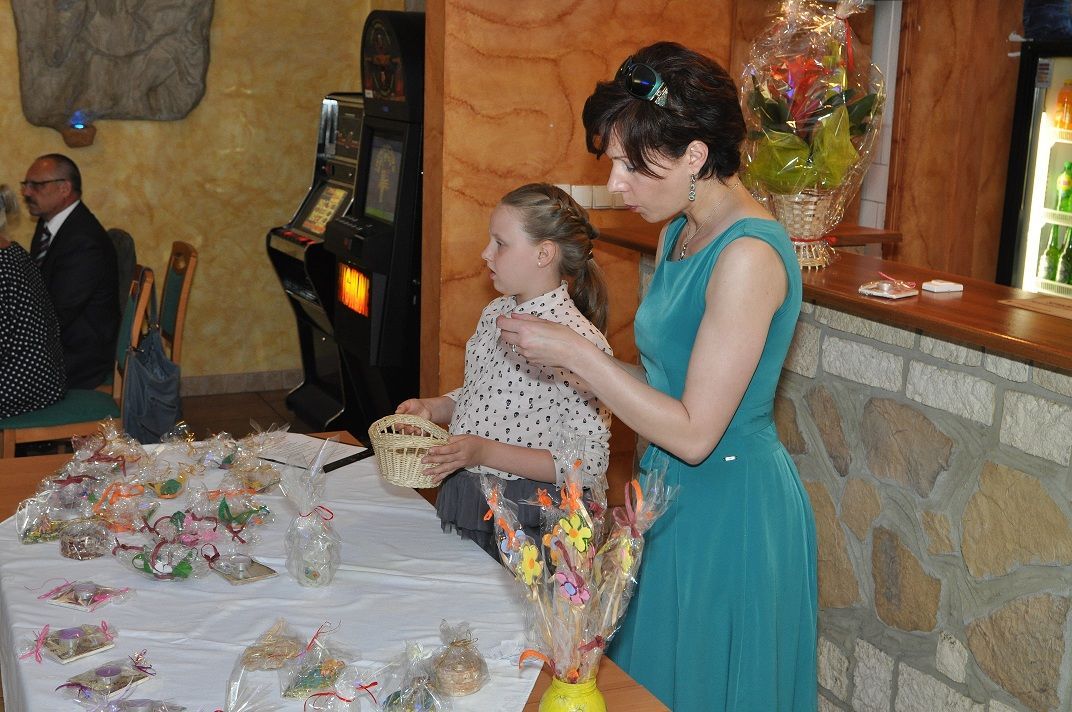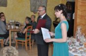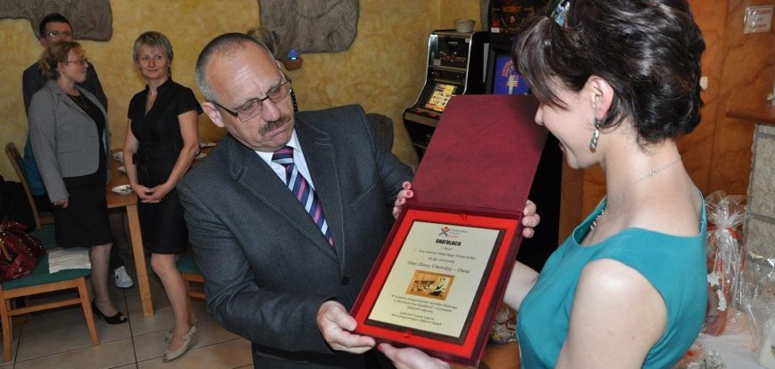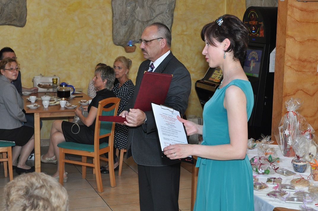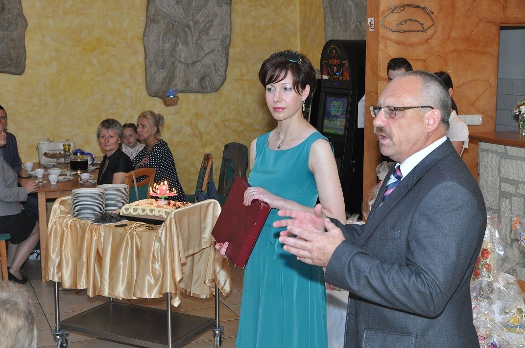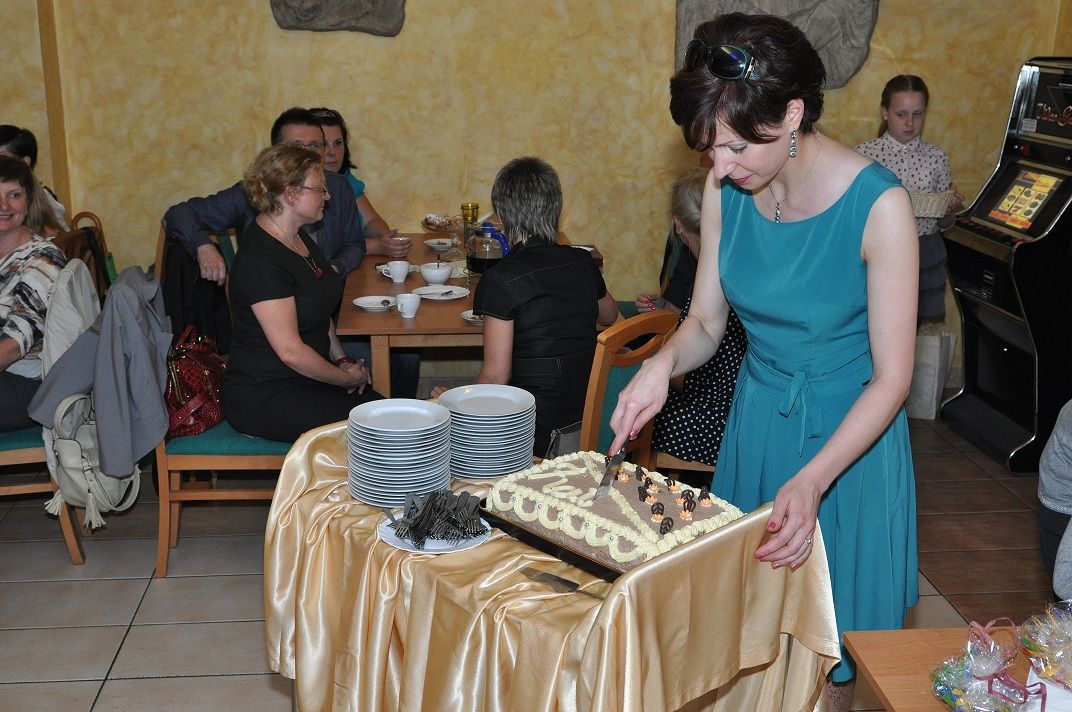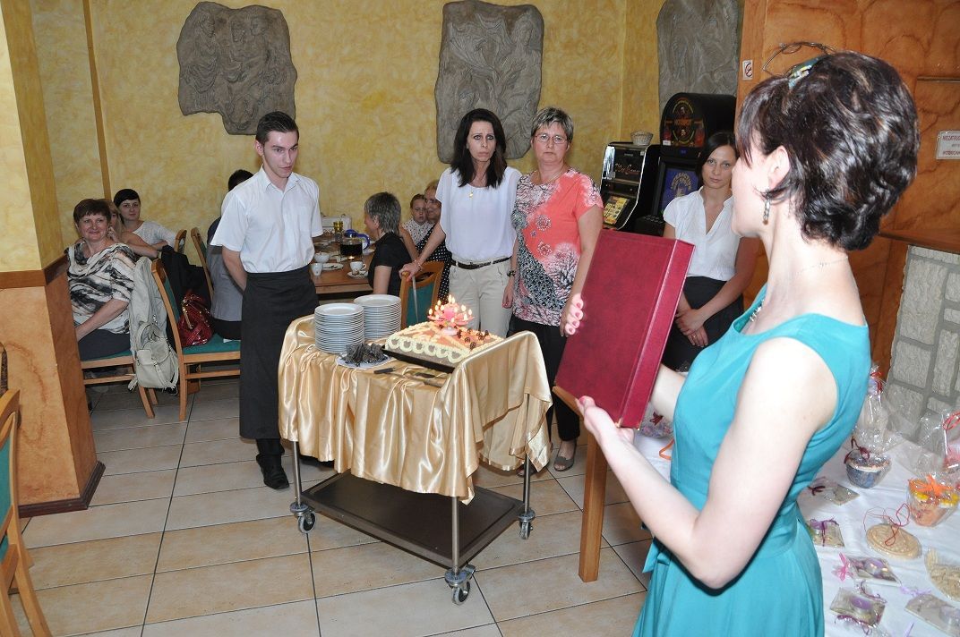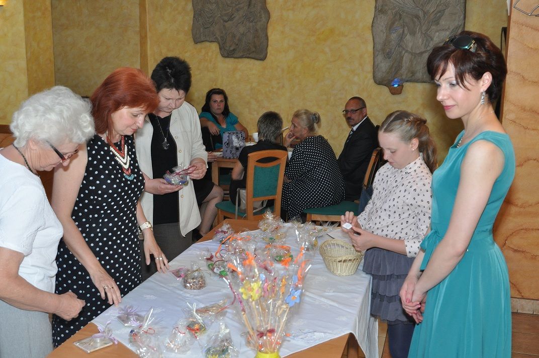 Po słodkim poczęstunku przystąpiłam wraz z moją uroczą asystentką-Martą Czempiel do rozlosowania prawdziwej góry nagród. W końcu urodziny do czegoś zobowiązują. Pragnę w tym miejscu podziękować raz jeszcze Panu Dyrektorowi Zygmuntowi Krawczykowi i całemu Zespołowi na hojność i wspaniałe prezenty. Podziękowania kieruję także do Krystyny Musik z KMS GANTOS i Ewy Chrzan z Gabinetu Masażu „EWA” za ufundowanie nagród. Dziękuję gorąco właścicielom  restauracji VICTORIA za pomoc w organizacji urodzin i nieustającą gościnność. Specjalne podziękowania składam piekarskim Amazonkom; z rąk ich przedstawicielek otrzymałam piękny kwiat.