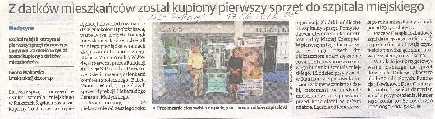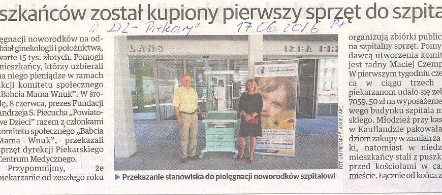 “Dziennik Zachodni” z 17 czerwca 2016 porawca w artykule do zbiórki w ramach akcji “Babcia, Mama, Wnuk”, zainicjowanej przez radnego Macieja Czempiela, na rzecz zakupu sprzętu do piekarskiego szpitala. Pierwsze urządzenia trafiły już do piekarskiej placówki.
