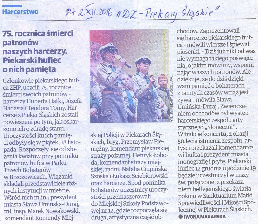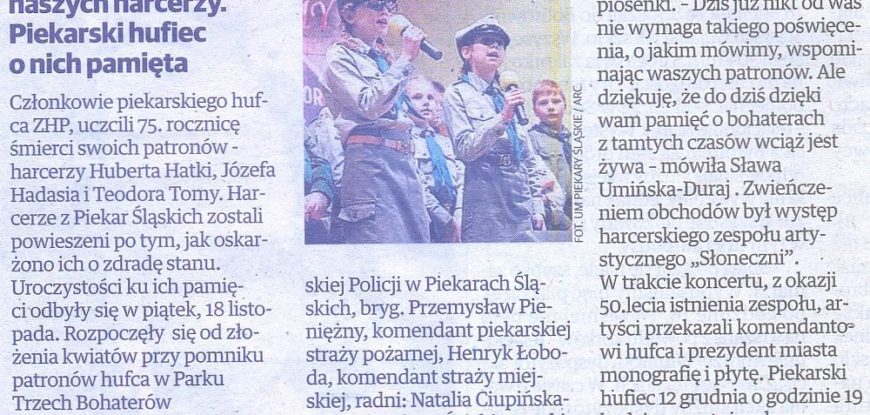 Radni Obywatelskiego Klubu Radnych wzięli udział w obchodach 75.rocznicy śmierci patronów piekarskiego hufca ZHP, które odbyły się 18 listopada w Parku Trzech Bohaterów w Brzozowicach-Kamieniu. O szczegółach informuje w artykule z 2.12.2016 piekarski dodatek “Dziennika Zachodniego”.