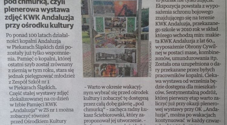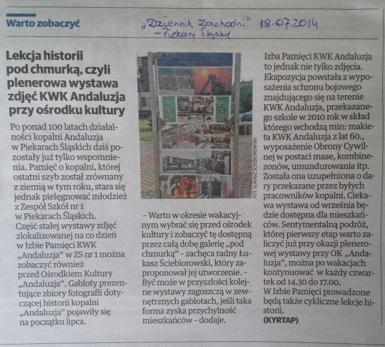 “Dziennik Zachodni – Piekary Śląskie” z 18.07.2014 przybliża wystawę zdjęć związanych z KWK Andaluzja w zewnętrznych gablotach OK Andaluzja. Prezentacja zdjęć, którą zaproponował radny Łukasz Ściebiorowski, stanowi część wystawy w Izbie Pamięci KWK Andaluzja w Zespole Szkół nr 1 w Piekarach Śląskich.