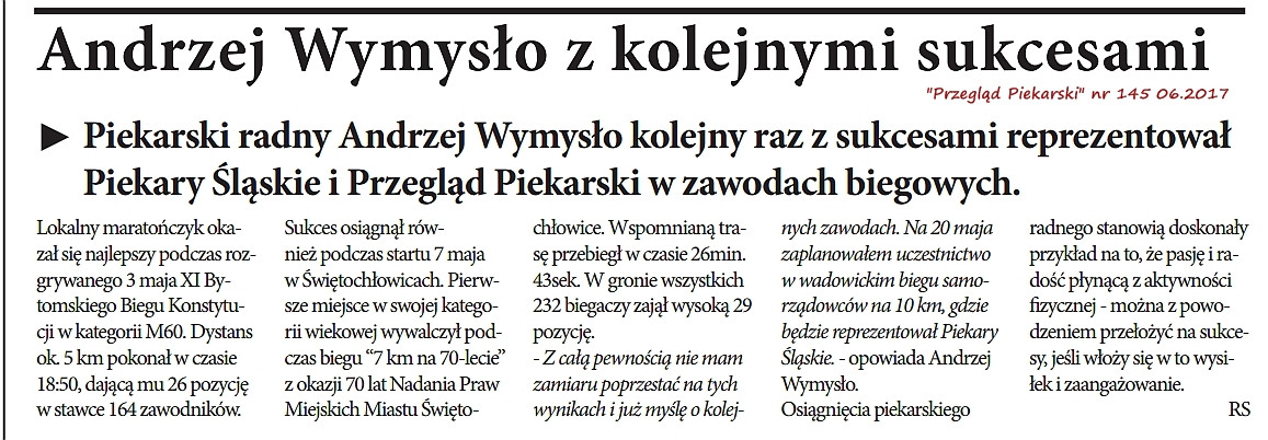Radny Andrzej Wymysło z kolejnymi osiągnięciami sportowymi o czym informuje “Przegląd Piekarski” nr 145 z czerwca 2017.