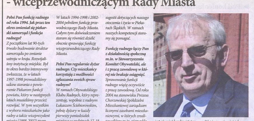 “Przegląd Piekarski” prezentuje rozmowę z jednym z najdłużej pełniących swoją funkcję piekarskich rajców Grzegorzem Gowarzewskim (OKR). Piekarski radny przybliża również zmiany jakie nastąpiły w samorządzie od lat 90-tych.