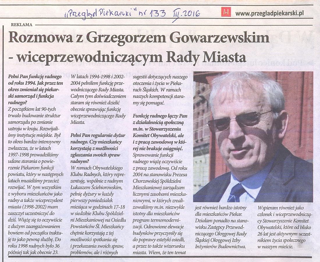 Artykuł "Przeglądu Piekarskiego" – wywiad z radnym Grzegorzem Gowarzewskim