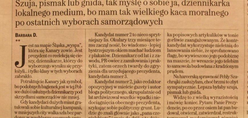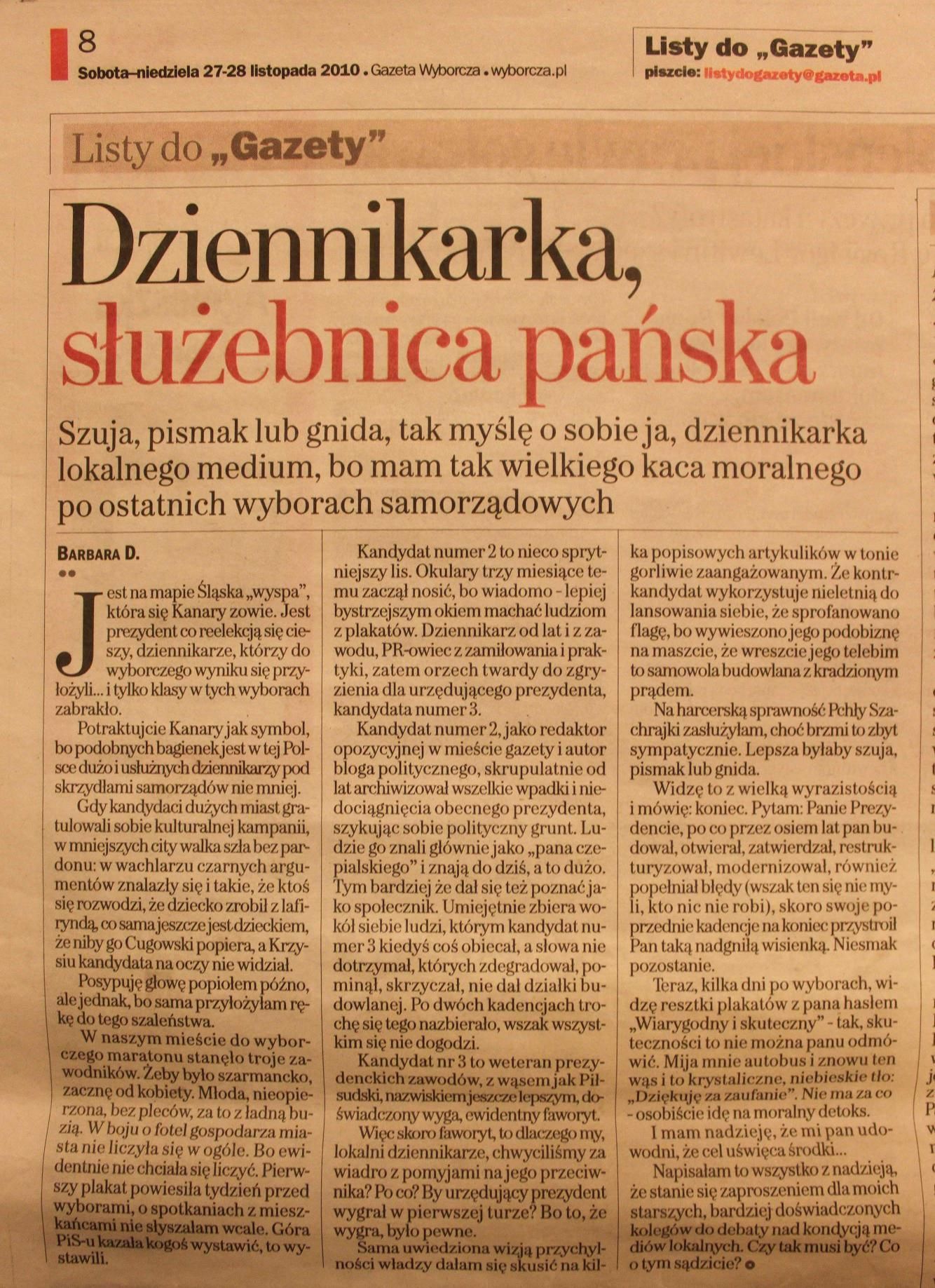 Materiał Gazety Wyborczej. Przedrukował go Przegląd Piekarski, w którym ukazał sie także obszerny wywiad z Dagmarą Bednarek. Nic dodać, nic ująć – najlepsze podsumowanie kampanii wyborczej w wyborach samorządowych 2010 roku.