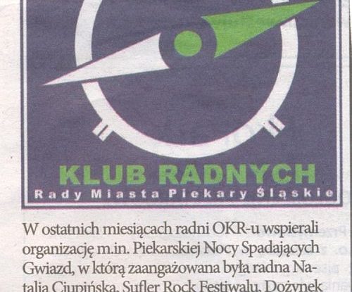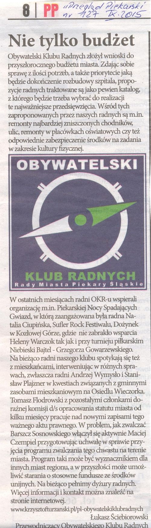 “Przegląd Piekarski” nr 127 z września 2015 przybliża funkcjonowanie Obywatelskiego Klubu Radnych w artykule “Nie tylko budżet”.
