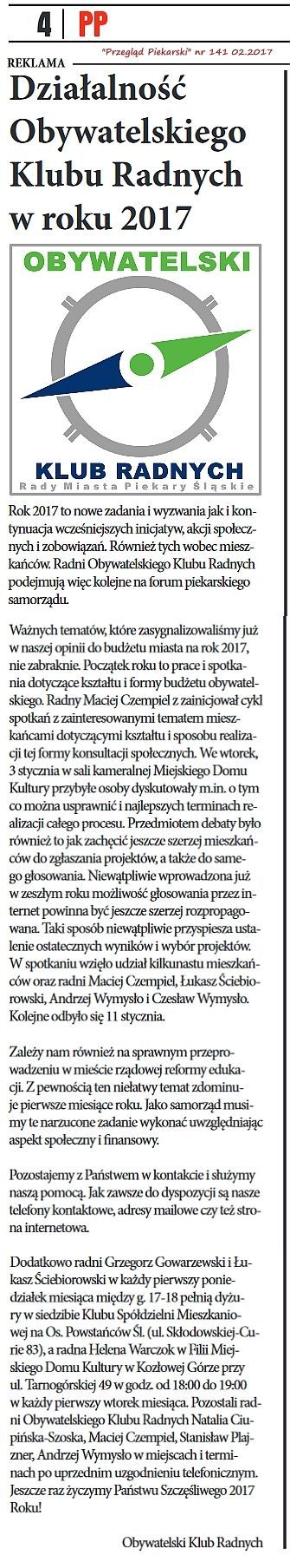 W artykule “Przeglądu Piekarskiego” nr 141 z 02.2017 Obywatelski Klub Radnych przybliża plany działalności na rok 2017.